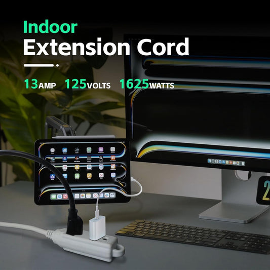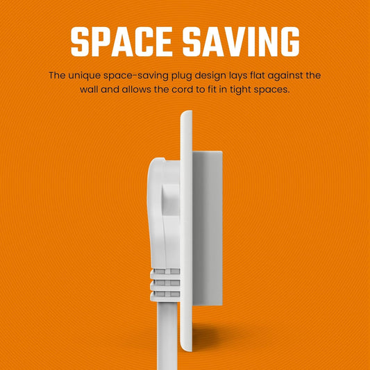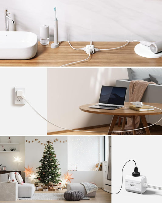 10 Ft Flat Plug Extension Cord - 16 AWG 3 Prong Grounded Cable with 3 Outlets, Indoor Use, White
