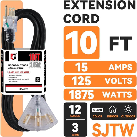 10 Ft Outdoor Extension Cord with 3 Power Outlets - Heavy Duty Black Cable, 3 Prong Grounded Plug, UL Listed