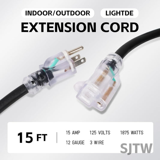 15 Foot Lighted Outdoor Extension Cord - Heavy Duty 12/3 SJTW Black Cable with Grounded Plug for Lawn, Garden, Appliances