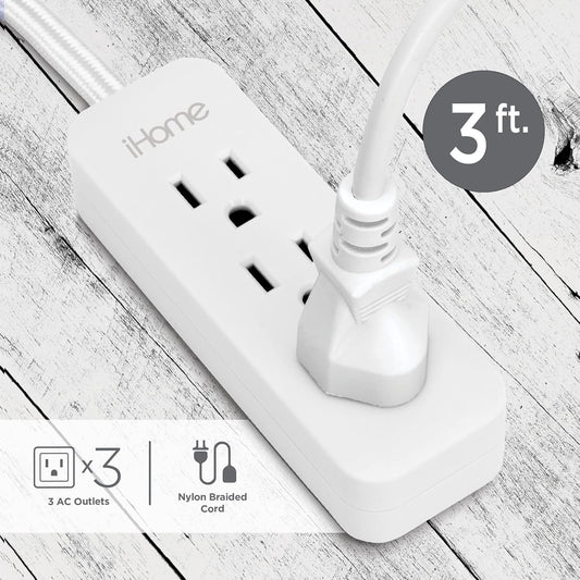 3 Outlet Power Strip with 3ft Nylon Braided Cord, Flat Plug - Ideal for Kitchen & Furniture - Heavy-Duty Surge Protector