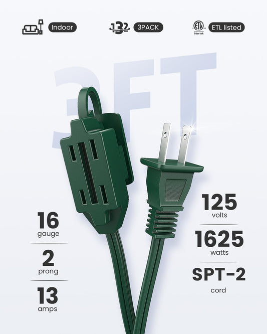3 Pack PLUGTUL Green 2 Prong Indoor Extension Cord 3 FT, 3 Polarized Outlets with Safety Cap, ETL Listed