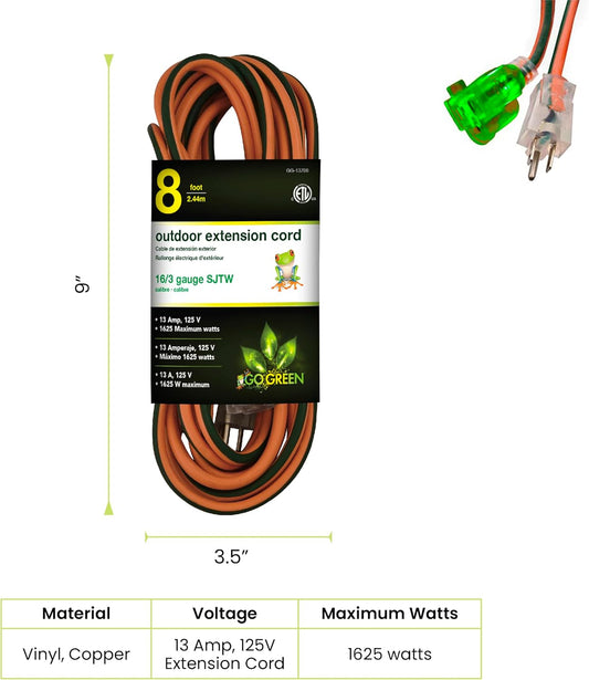 GoGreen GG-13708 16/3 Heavy Duty Extension Cord - 8 ft - Orange by Go Green Power Inc.