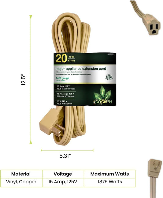 Heavy Duty 20ft Beige Appliance Cord - 14/3 SPT-3, Grounded Plug, Kink-Free - Ideal for Large Indoor Appliances by GoGreen Power Inc.