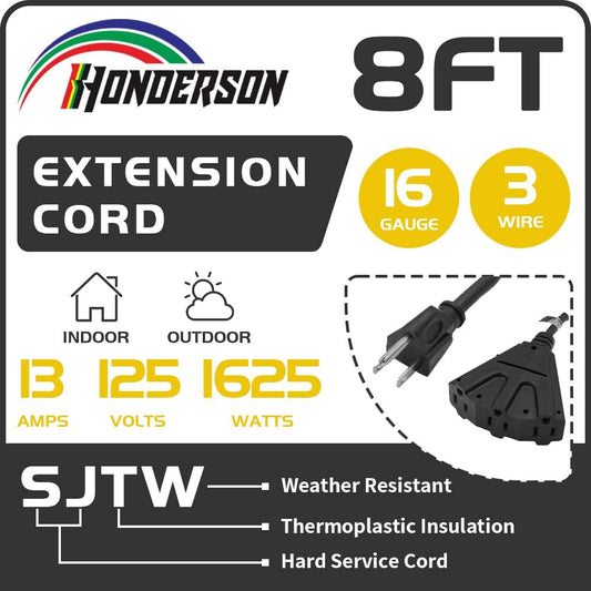 HONDERS0N 3-Outlet Weatherproof Indoor/Outdoor Extension Cord - UL Listed, 16 Gauge 8FT Black Heavy Duty Power Cord with Multiple Outlets