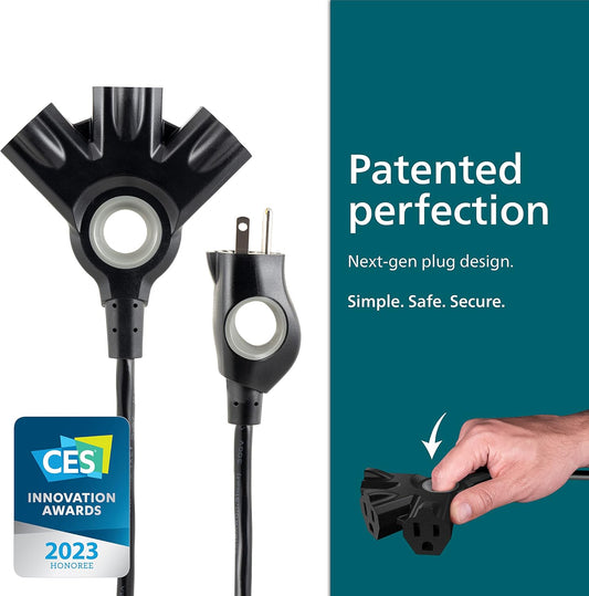 25ft Waterproof Outdoor and Indoor Extension Cord - 3 Prong, 3 Outlet, 12 Gauge, 15 AMP, 125 Volts - ETL Listed - Black