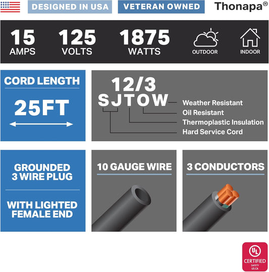 Thonapa 25 Ft 12 Gauge SJTOW Oil Resistant Flame Retardant Heavy Duty Extension Cord - Black Outdoor Electric Cable for Appliances, Farm & Ranch