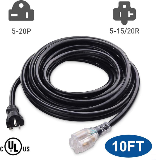 Yodotek 10FT 12 Gauge Heavy Duty NEMA 5-20P/NEMA 5-15/20R Extension Cord - Indoor/Outdoor, 20A 125V