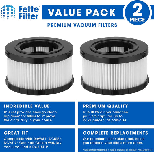 Replacement HEPA Filter Set for DEWALT DC515 DCV517 DCV517B Wet Dry Vacuums - Includes 2 Filters - Part # DC5151H by Fette Filter