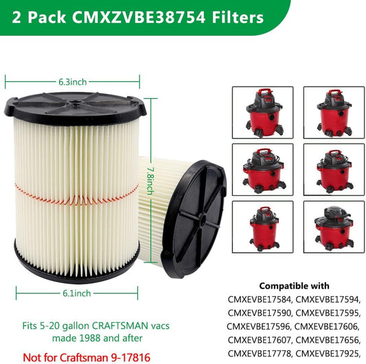 Craftsman CMXZVBE38754 Replacement Vacuum Filter - 2 Pack Red Stripe General Purpose Filter for 5-20 Gallon Shop Vacuum