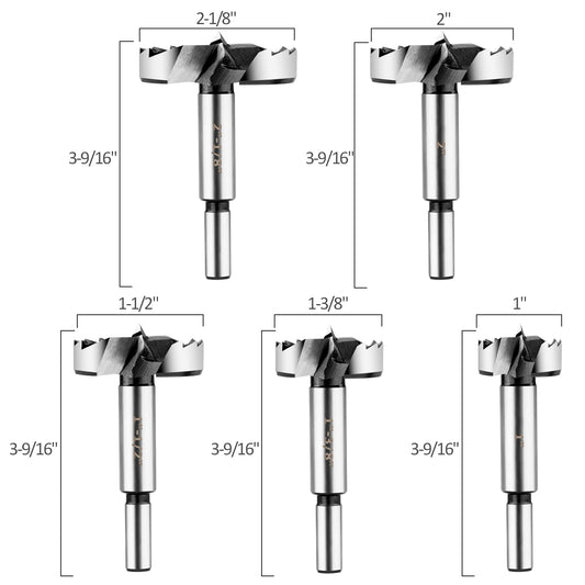 5-Piece HPHOPE Forstner Bit Set for Wood Drilling, Round Shank, Sizes 1"-2-1/8" w/ Storage Case - Drill Accessories