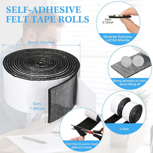 Black 2 Inch Zonon Felt Strip Rolls with Adhesive Backing - 4 Rolls of 120 Inch Self Stick Heavy Duty Polyester Tape for Furniture Protection and DIY Adhesive