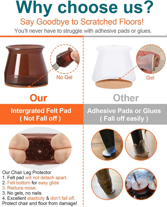 Set of 24 Brown Chair Leg Floor Protectors - Furniture Felt Pads for Hardwood Floors - Silicone Caps for Chair Legs (Large Size: 1.3''-2'')