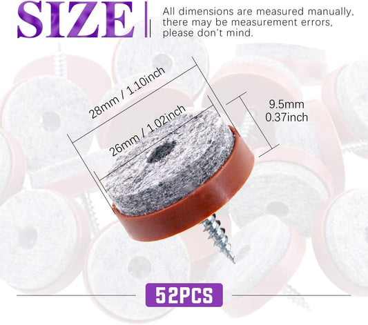 52Pcs 28mm Brown Furniture Felt Pads with Screw-on Non Slip Slider for Chair Table Sofa - Floor Protector for Wooden Leg Feet