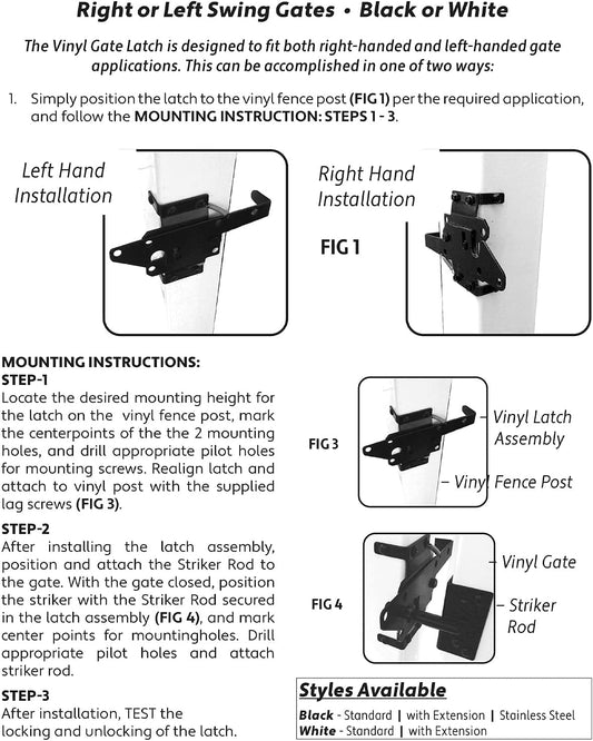 White Vinyl Gate Latch with Mounting Hardware for Vinyl, Wood, PVC Fencing - 90 Degree Bracket for Secure Gate Connection