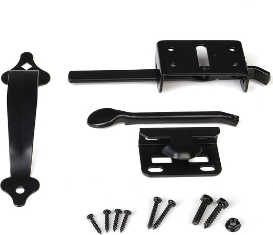Heavy Duty Self-Locking Gate Latch Kit for Wooden Fence & Swing Outdoor Gate - Steel, Black Finish, 8 inch Handle