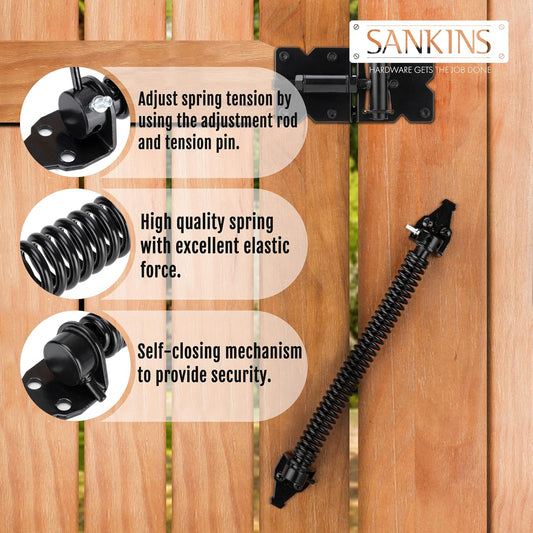 14" Heavy Duty Outdoor Gate Spring Closer for Wooden/Vinyl Fence - Self Closing Metal Hardware with Adjustable Tool, Black (2 Pcs)