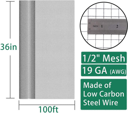 36" x 100' 19 Gauge Hot Dip Galvanized Hardware Cloth - 1/2" Mesh - Chicken Wire Fence Roll - Snake Fencing Mesh & Wire Cloth