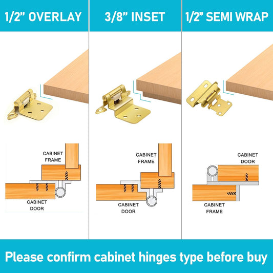 Pack of 50 Gold Semi-Concealed Self Closing Cabinet Hinges for Furniture Doors with Screws, 3/8 inch Size