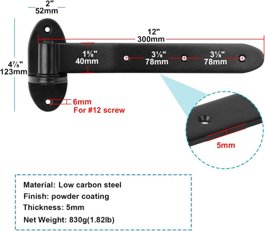 4 Pack 12" Black Strap Gate Hinges - Heavy Duty T Shape Cranked Band Lift Off Hinge for Shed Barn Fence - 3/16" Thick