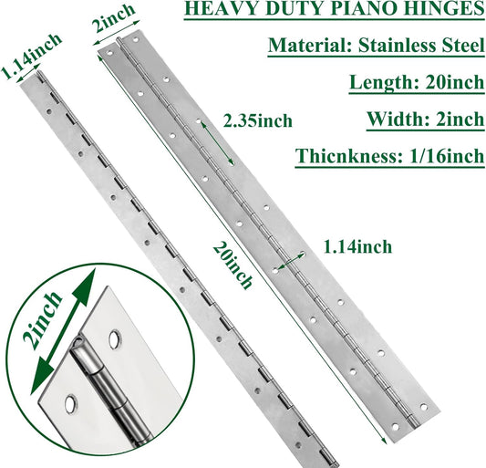 2Pack Heavy Duty Stainless Steel Piano Hinge Set - 2" Open Width x 20" Continuous Hinges with Holes for Cabinet Doors, Woodworking - Polished Furniture Hinges