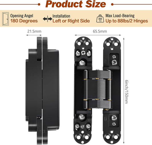 Hawaminent Invisible Door Hinges 2 Black 6-inch Upgraded 3-Way Adjustable Heavy Duty Hidden Hinge - Capacity up to 88lb