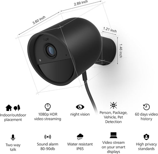 Philips Hue Wired Smart Home Security Camera in Black - 1080P HD Video with Night Vision and Motion Detection - Indoor/Outdoor Weatherproof - Two-Way Talk - Works with Hue App