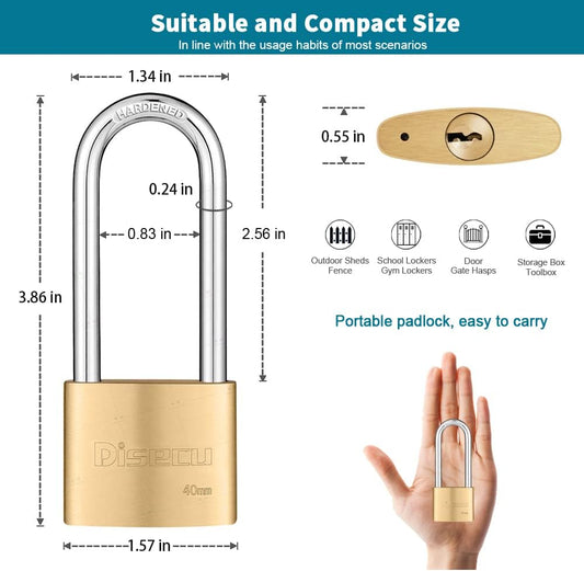 2 Pack of disecu Solid Brass Keyed Padlocks, 1-9/16" Wide Body, 2.5" Long Shackle - Outdoor Waterproof Lock for Shed, Gate, Locker, Fence - Includes Keys