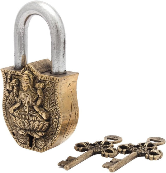 Handcrafted Brass Antique Padlock with Maa Laxmi Idol - Purpledip Medium (10465)