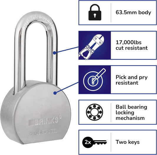 Commercial Solid Steel Keyed Padlock by BRINKS - 64 mm, Boron Steel Shackle, Durable Solid Steel Body