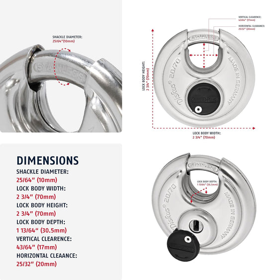 Heavy Duty ABUS Diskus 20/70 Stainless Steel Padlock with 3/8" Shackle - Rustproof Storage Lock - Made in Germany