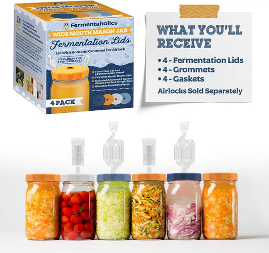 Wide Mouth Mason Jar Fermentation Lids with Grommet Hole for Airlock - Turn Your Jar Into a Fermentation Vessel - Compatible with Wide Mouth Jars - Airlocks Sold Separately