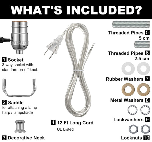 DIY Lamp Making Kit with Qc Lamp Socket Replacement, 3 Way Socket, 12ft Cord, Essential Hardware - Table/Floor Lamps Repair/Re-wire (Silver)