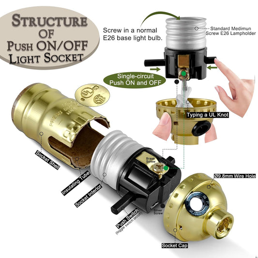 DiCUNO 2-Pack 3-Way Lamp Socket Replacement Kit - E26 Incandescent Light Socket for Table and Floor Lamps - Adjustable Settings with Switch Knob - Gold Color - UL Listed