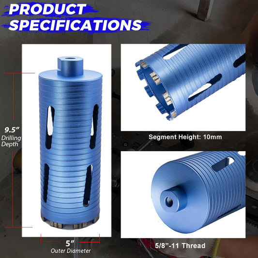 5" Dry Core Drill Bit with 3 Adapters: SDS Plus, SDS Max, 1/2" Hex - 9.5" Drilling Depth Diamond Concrete Core Bits for Brick, Block, Stucco, Masonry