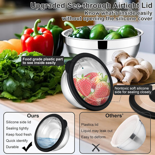 Stainless Steel Mixing Bowls Set with Lids, Nesting Design, Measurement Marks, Non-Slip Bottoms, 3QT & 5QT Sizes, Ideal for Mixing and Serving
