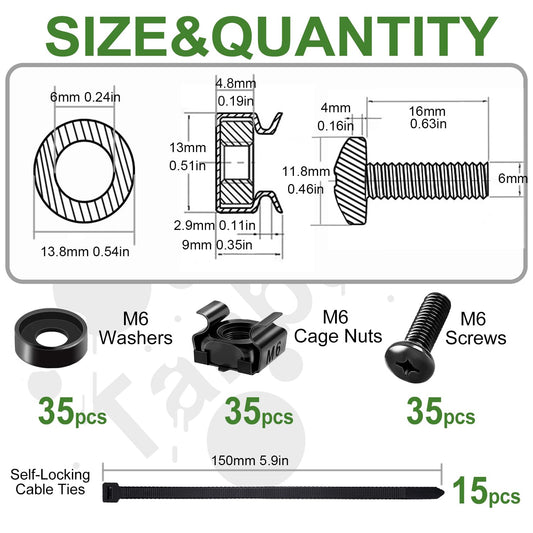 120-Piece M6 x 16mm Rack Mount Cage Nuts, Screws, Washers, Self-Locking Cable Ties - Server Rack Screws, Square Nuts for Cabinet, Shelves, Enclosures, Routers
