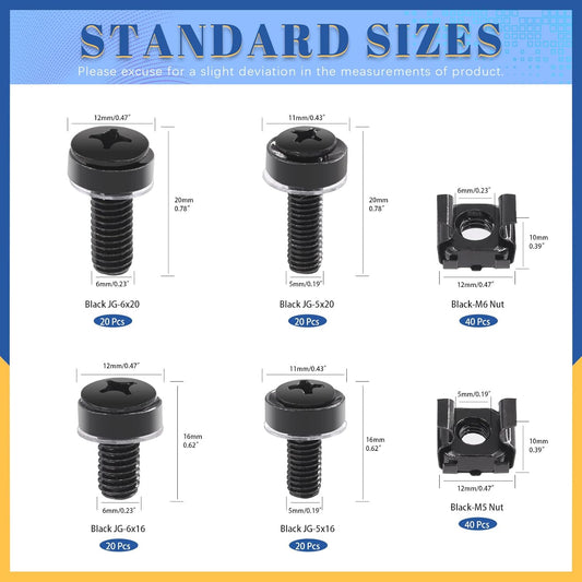 160-Piece M5 M6 Cage Nuts and Screws Set for Server Rack/Cabinet - Square Hole Hardware, Black - 80 Sets, M5 x 16mm/20mm, M6 x 16mm/20mm