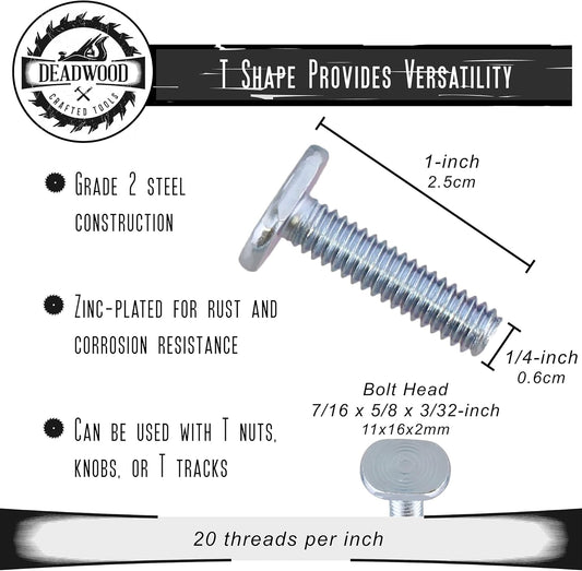 20 Pack 1in T Bolts for Woodworking, T Track Jig Bolts - Deadwood Crafted Tools DCT