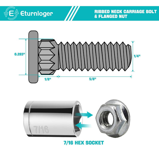 25 Pack of 1/4" x 5/8" Flathead Carriage Bolts with Knurled Neck for Garage Doors - 1/4"-20 Threads, Hex Nuts and Lock Nuts for 7/16" Socket