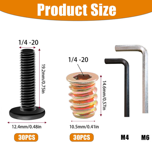 30 Sets of 1/4-20 x 3/4" Furniture Threaded Inserts for Wood - Hex Socket Drive Bolt Fasteners with Spanner