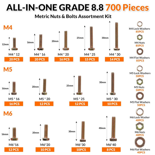 700PCS Grade 8.8 Metric Nuts and Bolts Assortment Kit - Heavy Duty Hex Head Screws and Nuts Washers Set - Yellow Zinc Plated - 13 Sizes Hardware for DIY