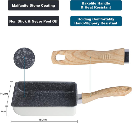 Square Nonstick Tamagoyaki Pan for Japanese Omelette - Rectangle Frying Pan with Wood Handle in White Color