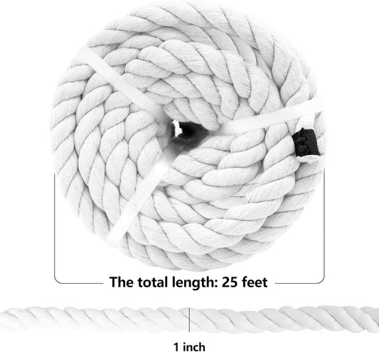 25 Feet White Cotton Rope for Hanging Swing Decoration and Nautical Crafts - 1 Inch Thick Natural Cotton Rope for Kids' Tug of War