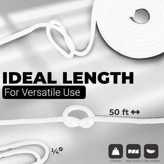 50 Ft White Nylon Rope 1/4 inch - Multipurpose Outdoor Rope for Marine, Camping, Laundry Line, and More - Durable Flag Pole Replacement Rope - RamPro