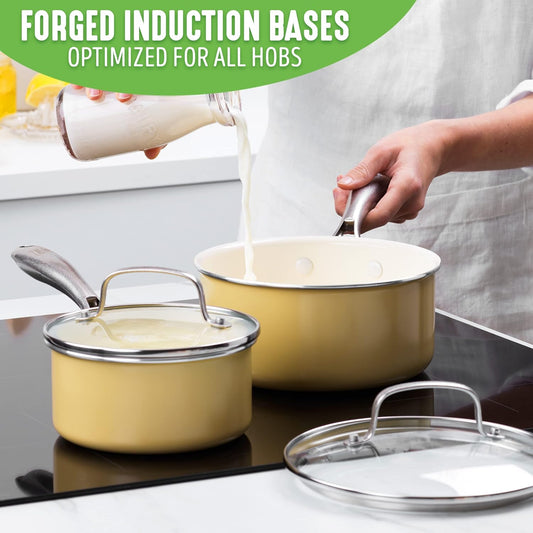 GreenLife Artisan Ceramic Nonstick Saucepan Set, 1QT and 2QT with Lids - Stainless Steel Handle, Induction Safe, PFAS-Free - Dishwasher & Oven Safe - Yellow