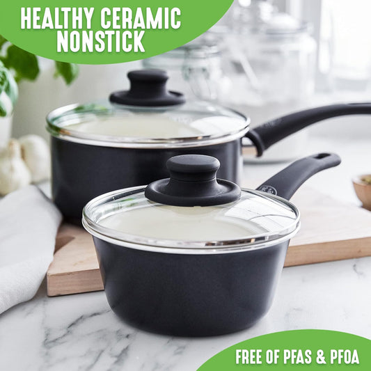 GreenLife Soft Grip Healthy Ceramic Nonstick Saucepan Set, 1QT & 2QT Pots with Lids, PFAS-Free, Dishwasher Safe - Black/Cream