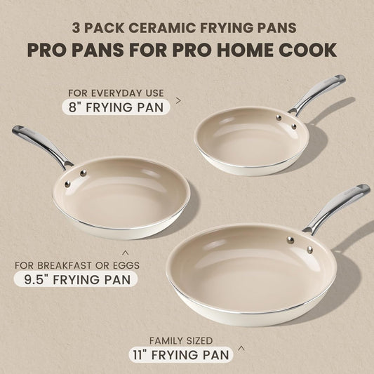 Kikcoin Ceramic Frying Pans Set - 8", 9.5", 11" Skillets with Stay Cool Handle, Non-Toxic, Dishwasher/Oven Safe - PFAS & PTFE & PFOA Free