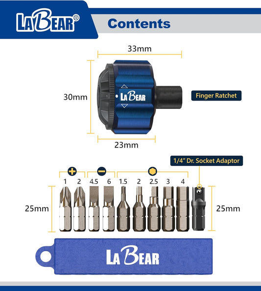 11pcs 1/4"DR Mini Palm Ratchet Kit with Screwdriver Bits - Gear Ratchet, Finger Ratchet, Philips, Slotted