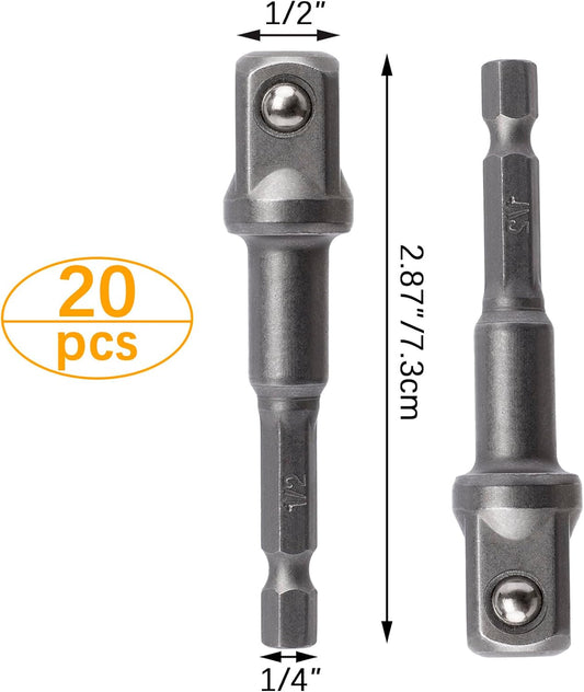 20 Pack 1/2 Inch Square Socket Adapter Bit Set with Hex Impact Driver Power Bits for Automotive DIY