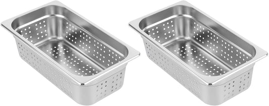 2 Pack Perforated Stainless Steel Steam Pans 1/3 Size - 4 Inch Deep Hotel Pan for Steaming, Washing Fruits & Vegetables - Easy to Clean - Silver